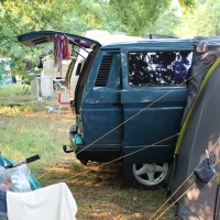lassen uns unter meterhohen, schattenspendenden Eichenbäumen nieder. Im Aufbau durch die Weser-Tour erprobt, steht das Fritz-Berger Zelt schnell an seinem angestammten Platz. Diesesmal wollen wir es genau machen und spannen den Vorbau vorschriftsmäßig ab, um eventuellen Wärmegewittern trotzen zu können. Das Lager aufgeschlagen, geht es in Badehose auf erste Entdeckertour. Hier und da ein Small-Talk, ein paar Blicke auf blecherne Schönheiten und dann ab Richtung Binnengewässer. Grandios was uns erwartet – weisser Sandstrand, Palmen, Beachbars und ein wohl temperierter Badesee lassen Urlaubsfeeling pur aufkommen. Besser kann man sich eine Location für ein Treffen wohl nicht wünschen. Am Abend dann noch Gutes vom Grill und bekanntes vom DJ auf der eigens aufgebauten Bühne am See. Zurück am Stellplatz stellen wir fest “Es könnte uns schlechter gehen!”und schlafen tiefenentspannt auf unseren Nomadenbetten ein.