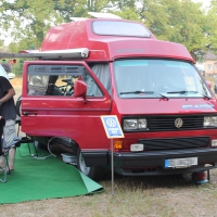 Autobahn ab um die Landschaft entlang der Bundes- und Kreisstrassen zu geniessen. Die Strecke führt uns u.a. durch das Wendland, welches duch die Castor-Transporte ein Begriff, aber durch seine weitläufigen Ländereien auch ein echtes Schmankerl ist. Endlose Getreidefelder, unter einem durch die riesigen Sprenkleranlagen entstandenen Regebogen, duftende Kiefernwälder, sowie wunderschöne mit Reet gedeckte Backsteinhäuser weisen uns den Weg in Richtung Elbe. Die T3 Klimaanlage, d.h. die offenen Fenster brinngen nur wenig Kühlung als die Sonne sich Richtung Zenit schiebt. Da wir so ungefähr wissen was uns erwartet, drängen wir wetterbedingt doch zum Ziel. Dann endlich gegen 12:30 Uhr fahren wir auf das grosszügig angelegte Areal des ehemailgen Campingplatzes am Neustädter See. Obwohl sich schon einige Bullis eingefunden haben, können wir platztechnisch aus dem Vollen schöpfen und