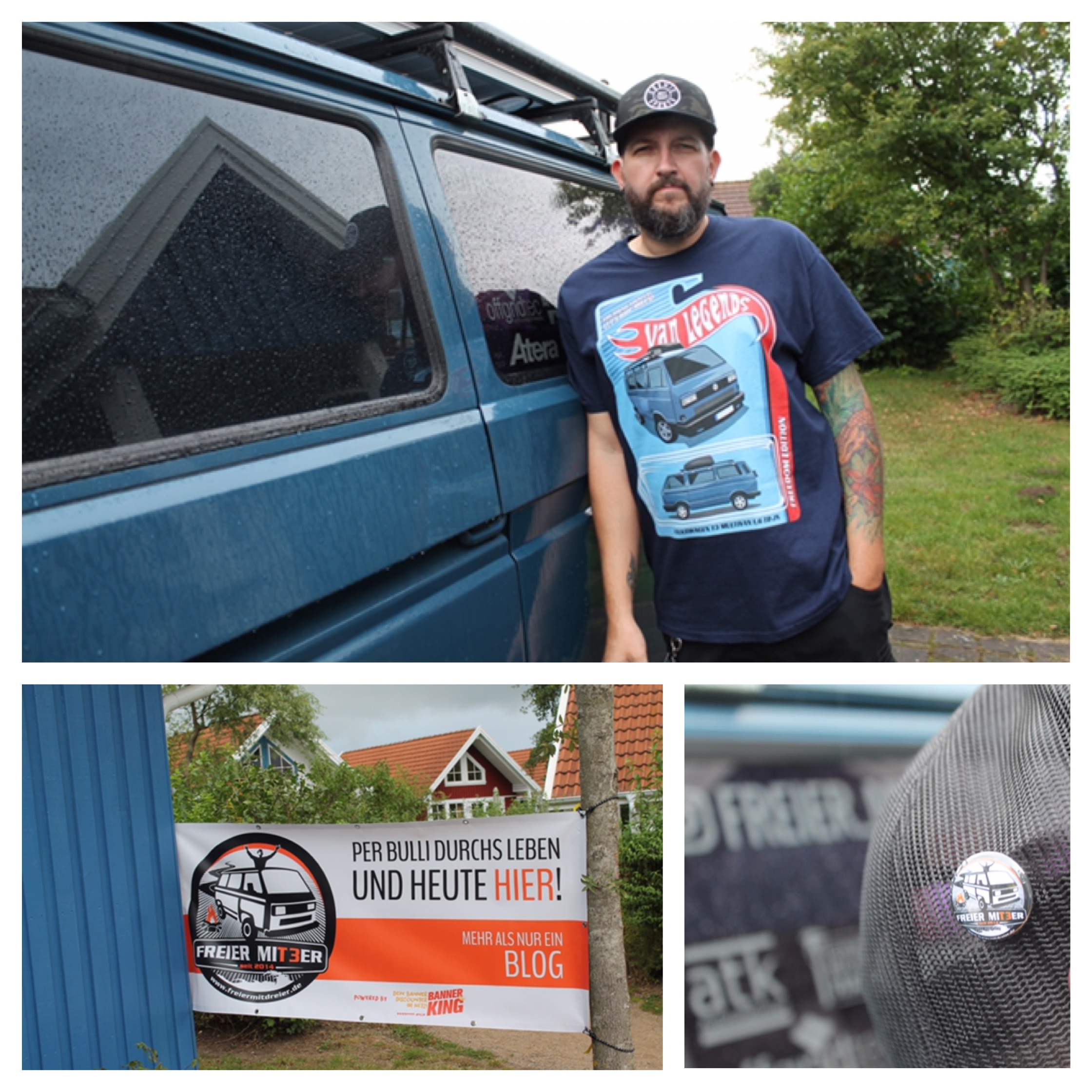 der Bullifahrer an. Ein Raunen geht durch den Bus als wir das grosse Schild vom Südseecamp erblicken. “Endlich wieder Zuhause!”, nuschele ich mir in den Bart und passiere mit unserem Gespann die Schranke. “Wow, hier ist aber schon was los!”, bemerkt mein Sohn als wir das Zentrum des Treffens erreichen. Gefühlt scheint dieser Donnerstag vom Trubel her ein Samstag und man darf gespannt sein wie das Ganze dann zum Wochenende hin aussehen wird. Wie jedes Jahr beziehen wir ein Häuschen im Feriendorf Sommarbÿ. Genug Platz für sechs und bestens geeignet zum Ausschwärmen in all die abenteuerreichen Richtungen des Südsse-Camps. Heute steht nur noch ein erstes Begehen des Platzes an und ein Besuch bei Ingo. Ingo aus Lübeck ist ein wahres Bulli-Urgestein und jedes Jahr fester Bestandteil der Teilnehmer auf der Pilzwiese. Mit seinen selbsgebauten Fahrrad-“Ratten” sieht man ihn oft über den Platz