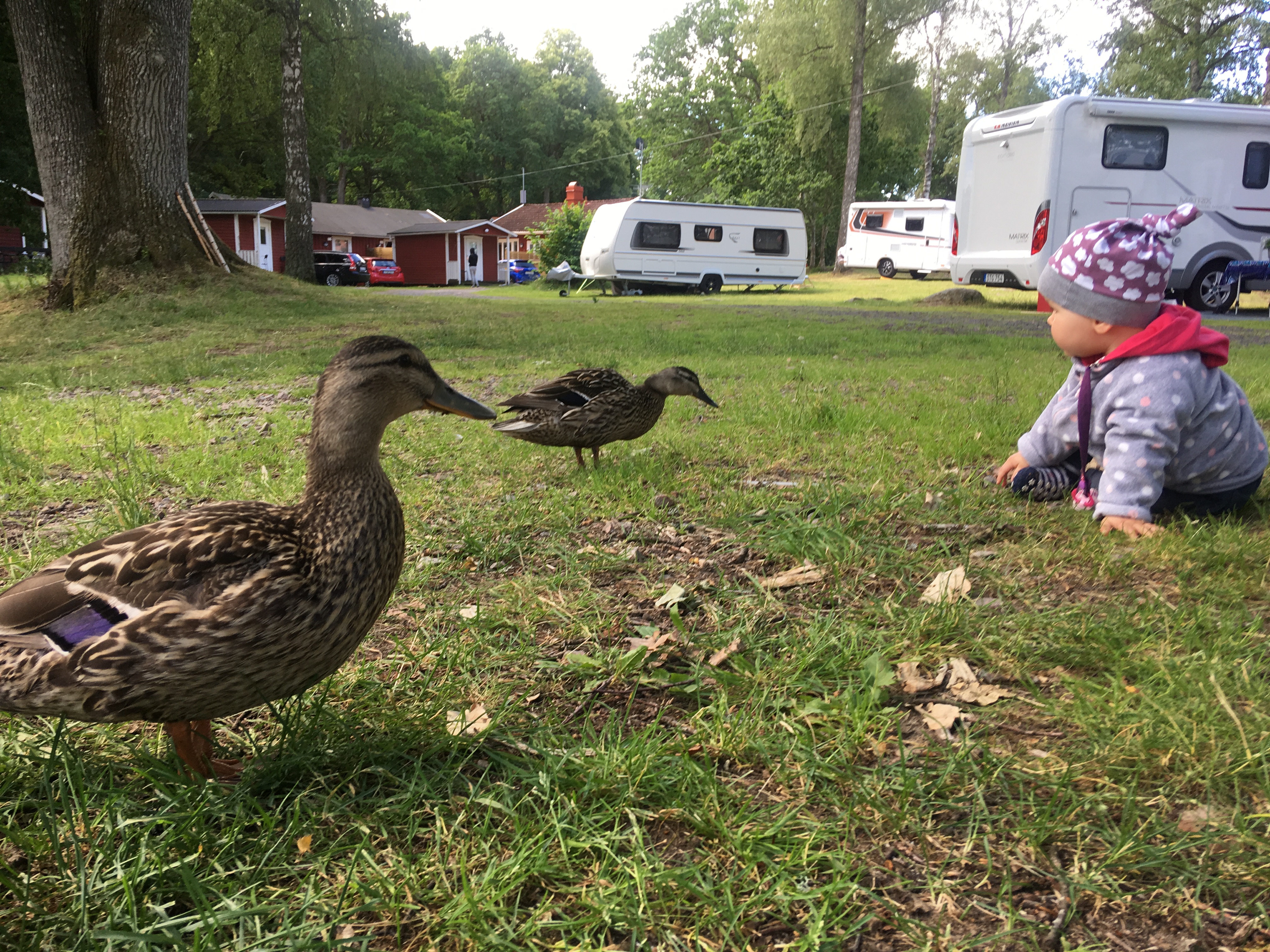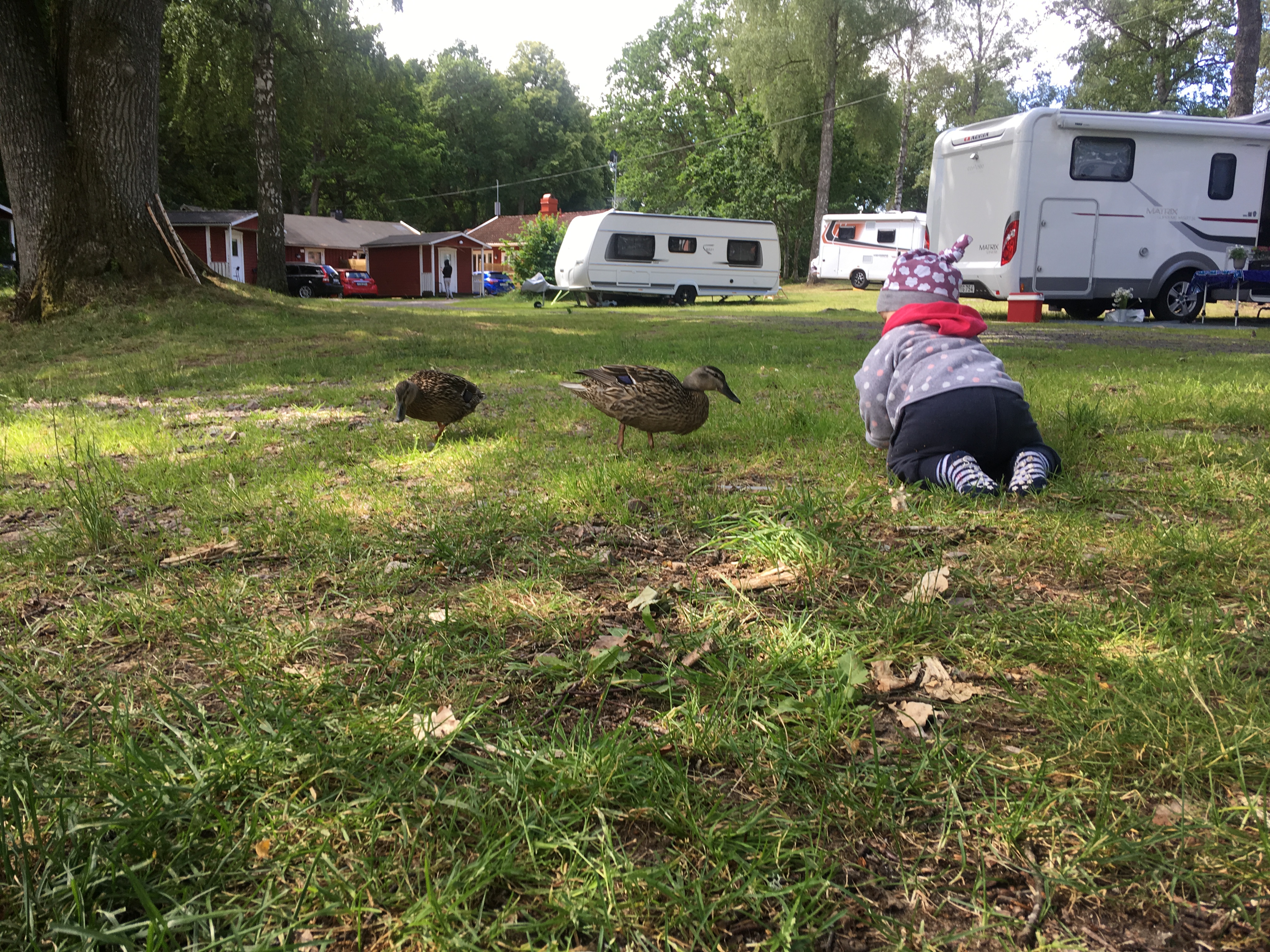 Unser Stellplatz liegt unter Kiefern und man hat von hier aus eine guten Blick auf das Gewässer. Um uns herum tummelt sich sofort eine Entenfamilie und Ida meint sich ihr krabbelnder Weise anschließen zu müssen. Am Hang unter uns hat es sich ein Paar aus Solingen gemütlich gemacht. Sie reisen ohne festes Ziel in Ihrem PKW und dem kleinen Igluzelt durch Schweden und seien so sagen sie hauptsächlich zum wandern hier. Bestimmt auch fein aber nicht ganz meins denke ich mir und öffne eine Dose „Norland Guld“ Lager-Bier dessen Logo mit Elch am See diesem Platz