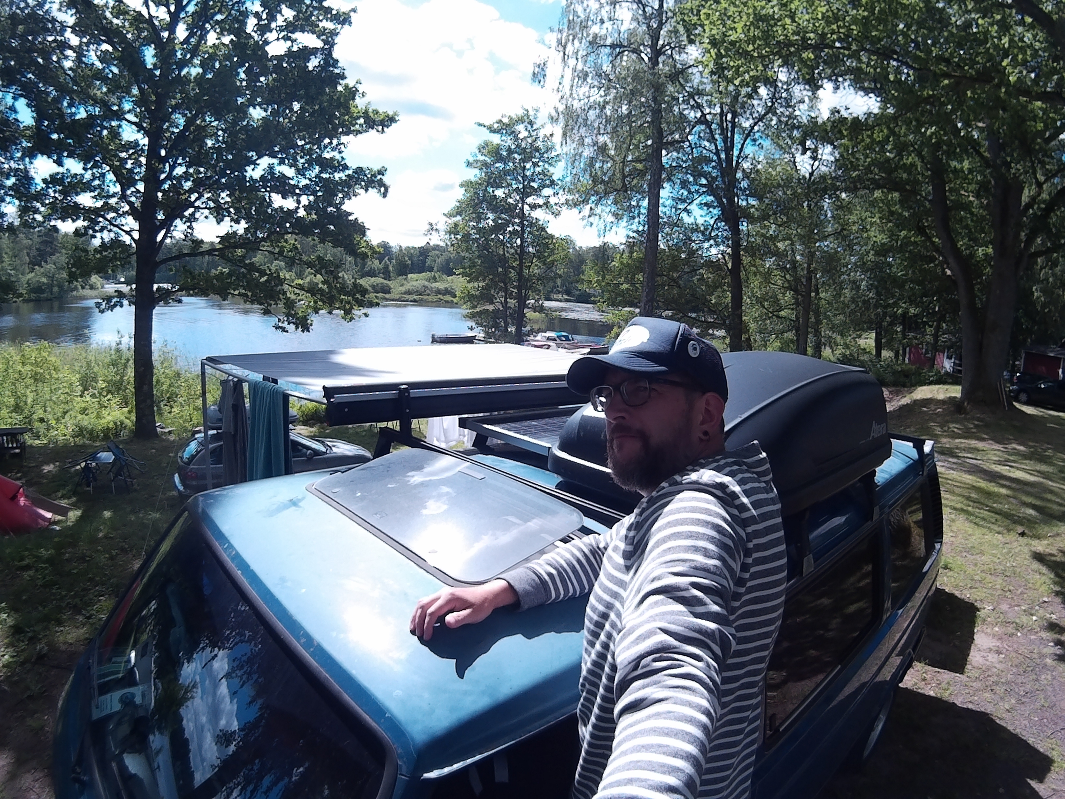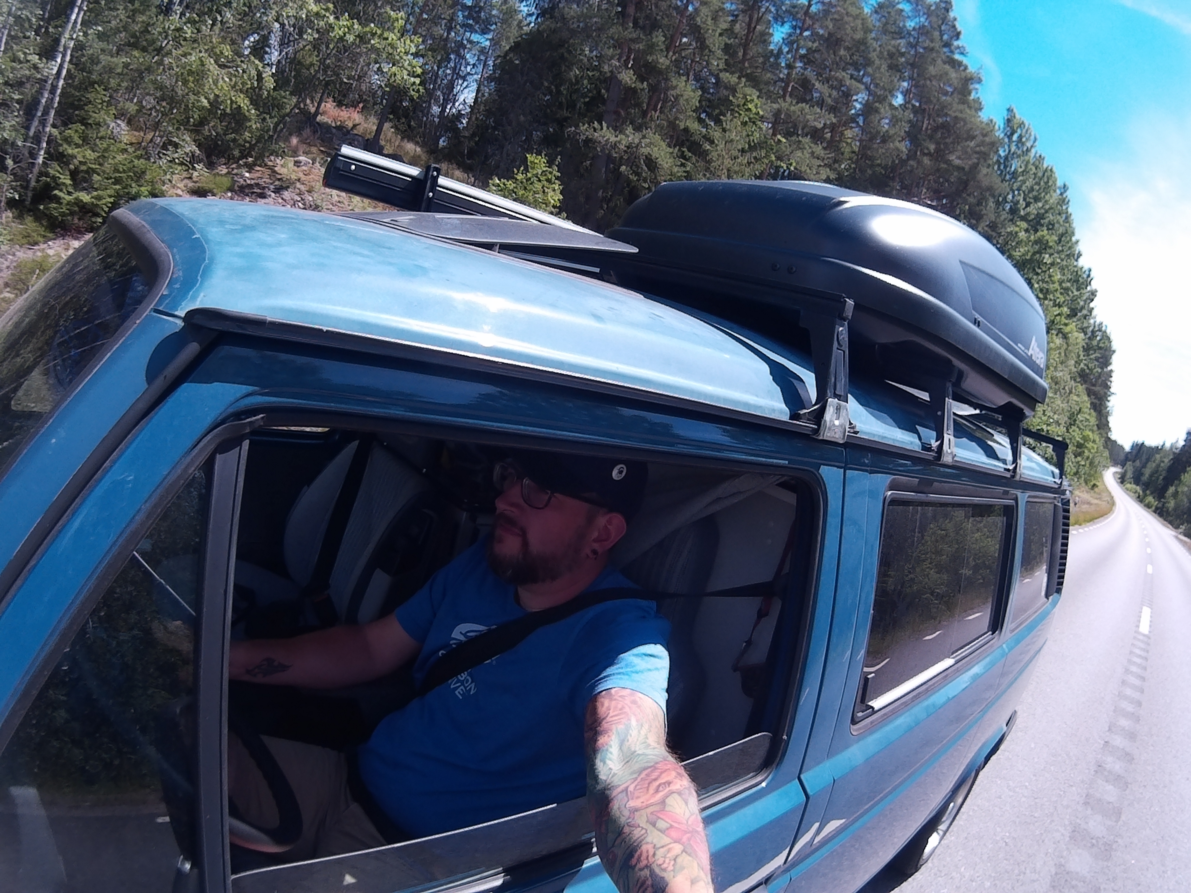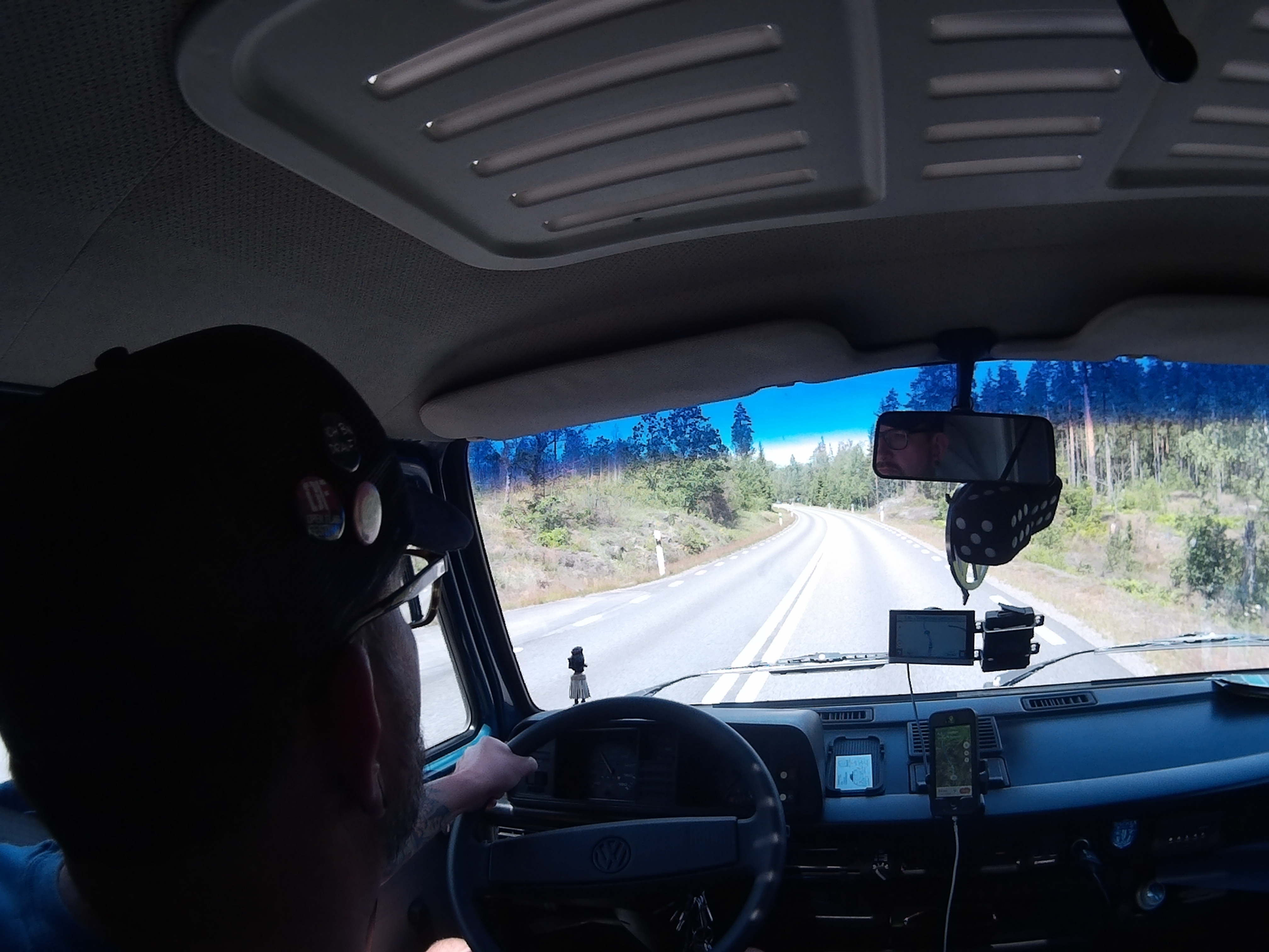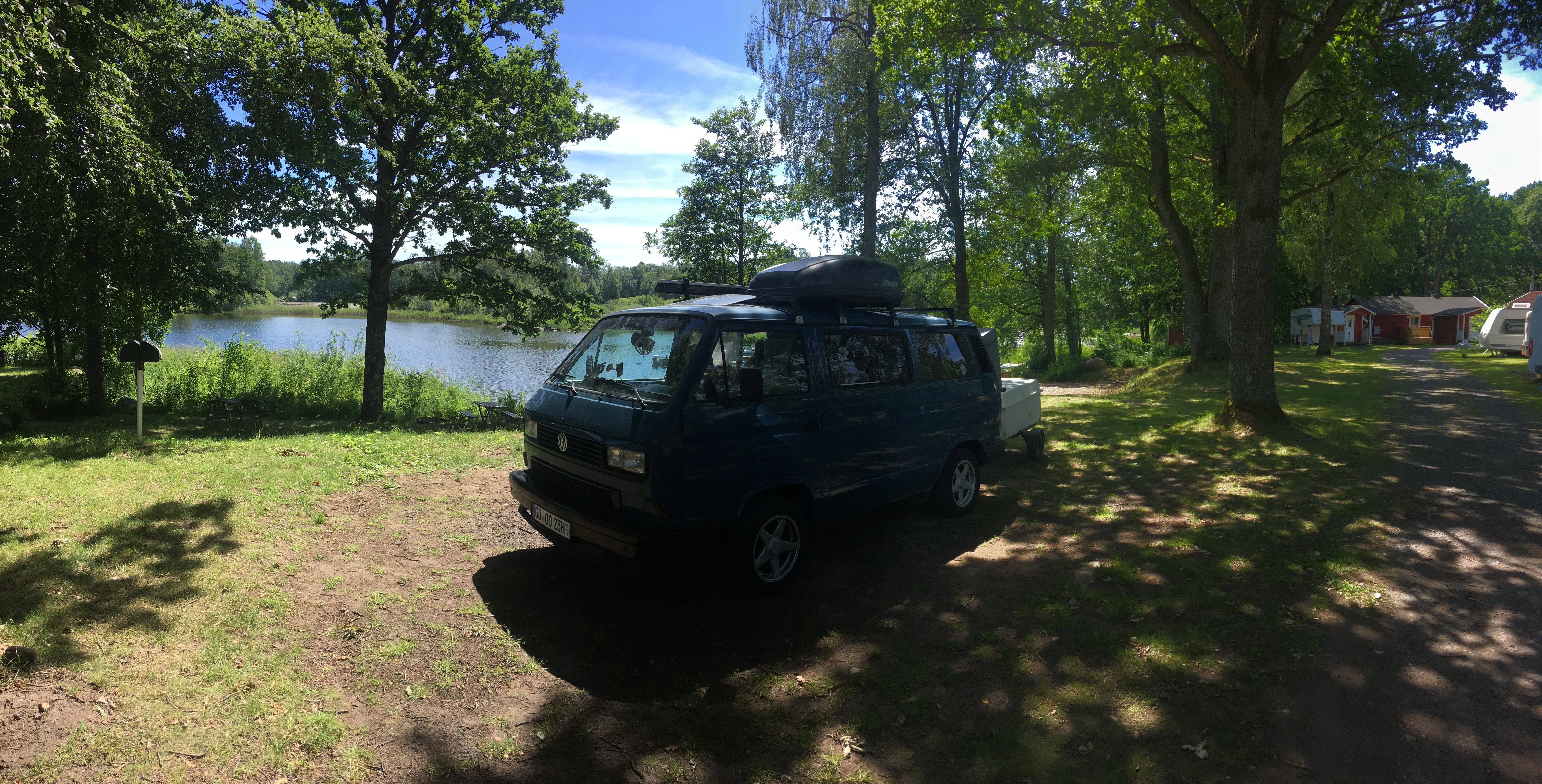 von Astrid Lindgren starten, zieht der Bus an uns vorbei. Ich grüße das Pärchen hinter dem mit einem Miniatur-Maibaum geschmückten Armaturenbrett. Die 25 Kilometer bis Vimmerby fahren die Bullis quasi im Konvoi. Ein Umstand den man, wenn zwei T3 mit JX Dieselmotor und damit sehr eingeschränkter Höchstgeschwindigkeit zur gleichen Zeit starten, kaum vermeiden kann. Wir passieren große Werbetafeln, die uns zum Lindgren-Museum sowie zum entsprechenden Erlebnispark leiten wollen. Für uns wäre das bestimmt interessant gewesen, aber für Ida mit ihren neun Monaten einfach zu viel. Wir wollen rasten und wählen den „Vimmerby Camping“ am See Nossen als Übernachtungsstätte aus. Der Platz ist mit seinem Jugendzeltlager-Flair nicht so ganz unser Ding, aber es soll ja auch nur für eine Nacht sein. An der Rezeption kommt ein junger Mann auf mich zu und meint dass einer meiner Schweinwerfer nicht richtig gehe. „Ich weiss, das ist schon vor unserer Schweden-Tour so gewesen aber leider auf der ToDoe-Liste verloren gegangen“, antworte ich und identifiziere den aufmerksamen Beobachter als Fahrer der Bundeswehr-Doka. Sein Name ist Marius. Marius hat den Bulli erst vor kurzem fahrfähig geschraubt und ist