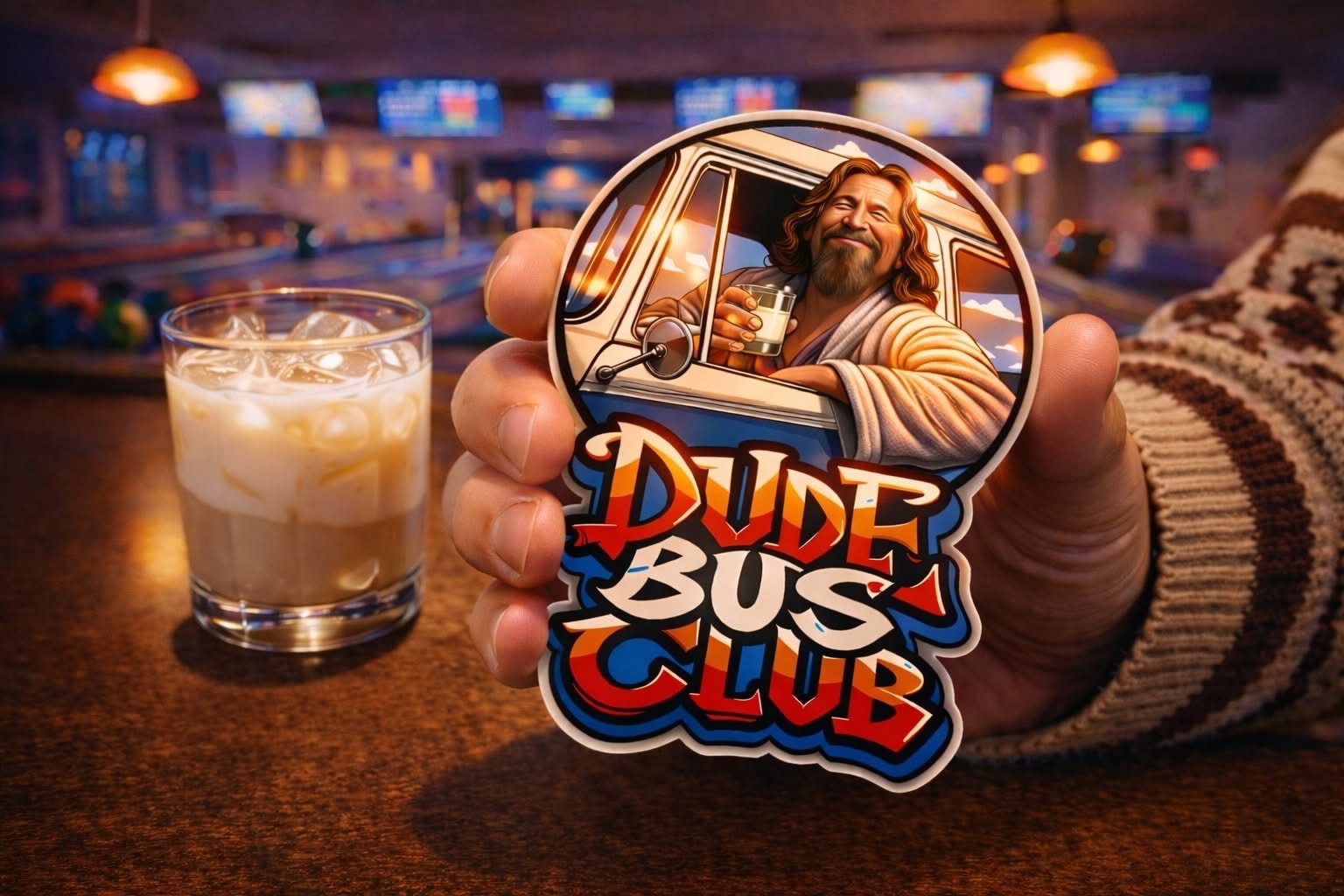 Den „Nude Bus Club“ kennt man ja, aber auch der Dude ist jetzt mit einem eigenen Club am Start. Zur Hölle mit dem Gran Torino und ab in den Transporter! „Ich bin der Dude, Mann – der mit dem Clubsticker!“. Werde auch Du Mitglied im „Dude Bus Club“! Darauf einen White Russian!