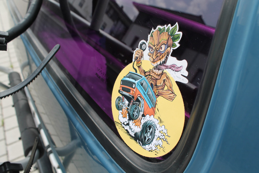 Ganz im Stil von “Big Daddy” steht hier der durchgeknallte Tiki mit einem T3-Rod am Start. Zwei wunderbare Subkulturen auf einem Sticker vereint. Das rockt…Drag me Baby!