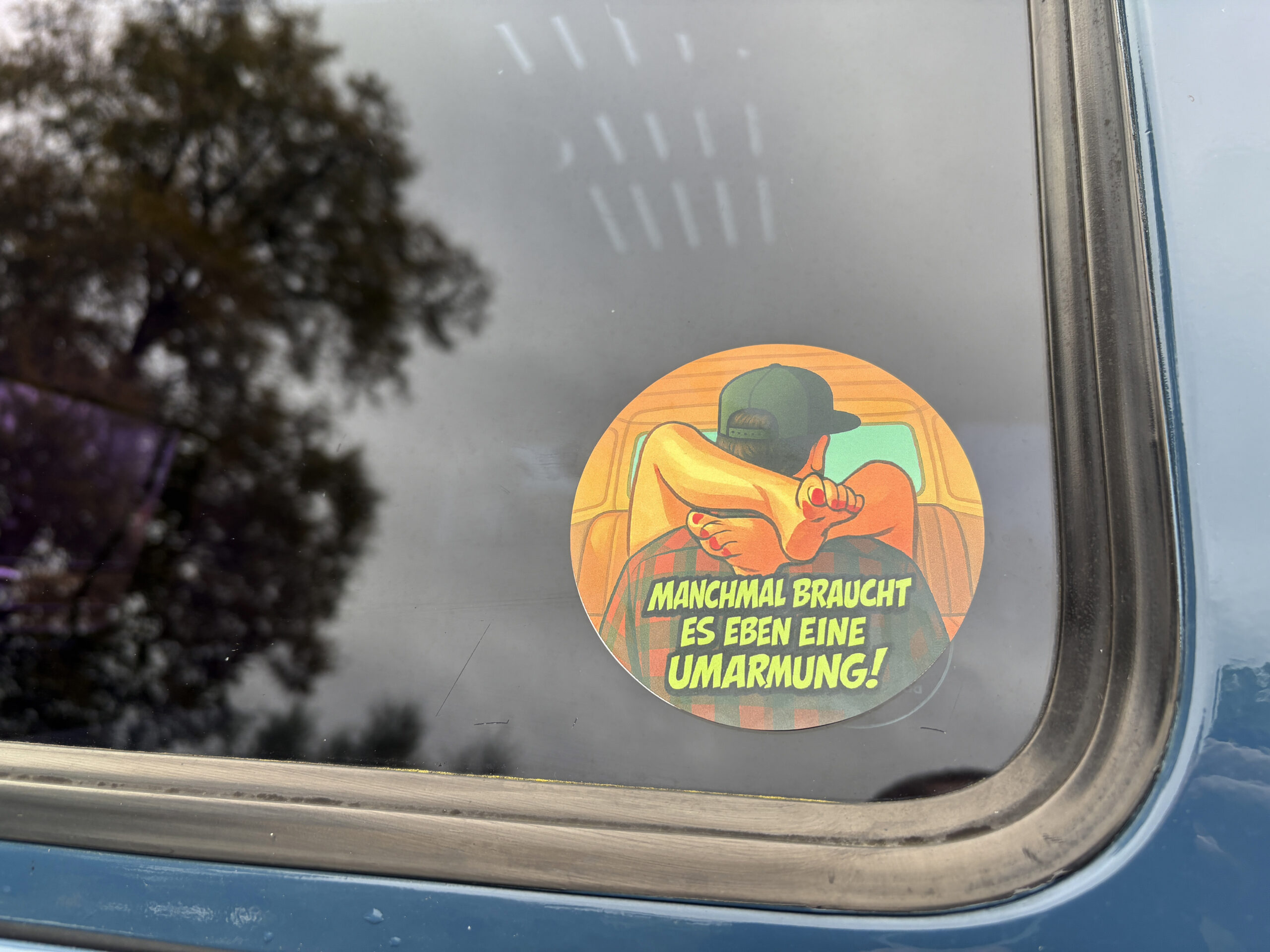 “Hug Me!” und “Free Hugs!” liest man auf Schildern allerorten. Ja richtig, manchmal braucht es eben eine Umarmung! Liebe rockt, besonders im Bus! Kleb Sie Dir, aber lass Dir dabei keine kleben!